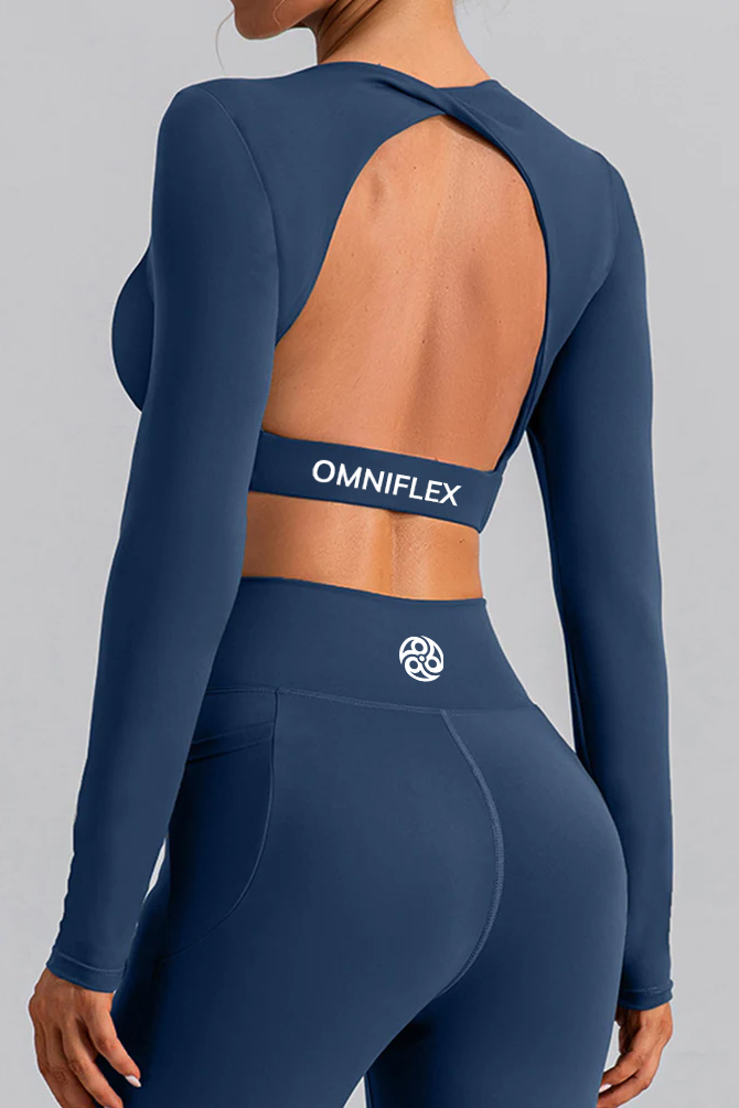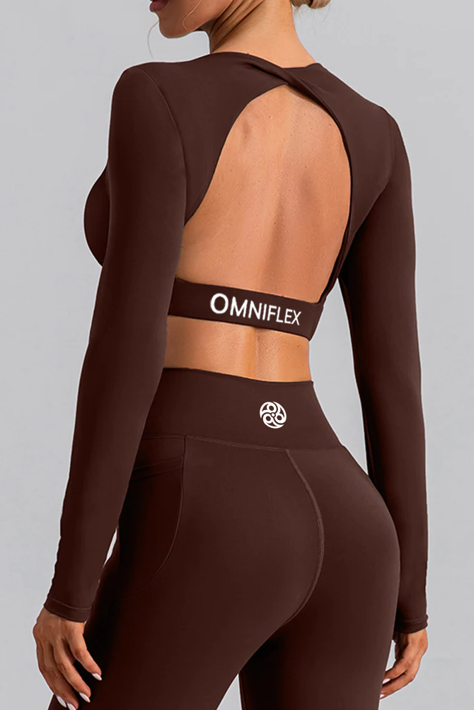Elevate your workout wardrobe with our exquisite women's activewear set, designed to blend style with functionality. This ensemble features a captivating backless yoga top that allows you to flaunt your back with elegance, paired with long sleeves for added warmth. The high-waisted and cropped design beautifully accentuates your curves, offering a flattering silhouette, while the flared bottoms with slit hems ensure unrestricted movement and flexibility. Crafted from premium, breathable fabrics, this set is perfect for enhancing your performance during workouts or adding a touch of style to your casual outings, embodying the essence of modern athleisure.